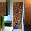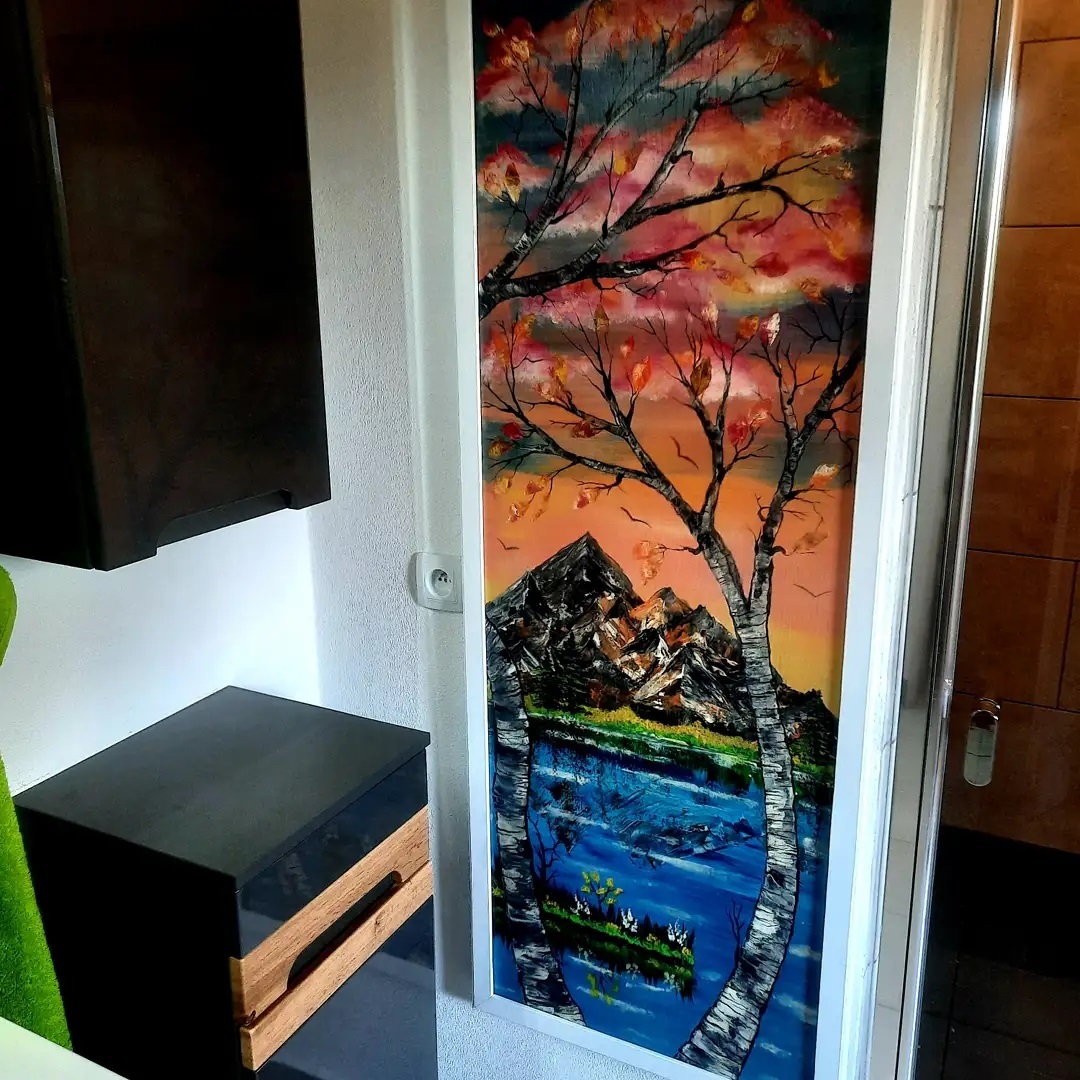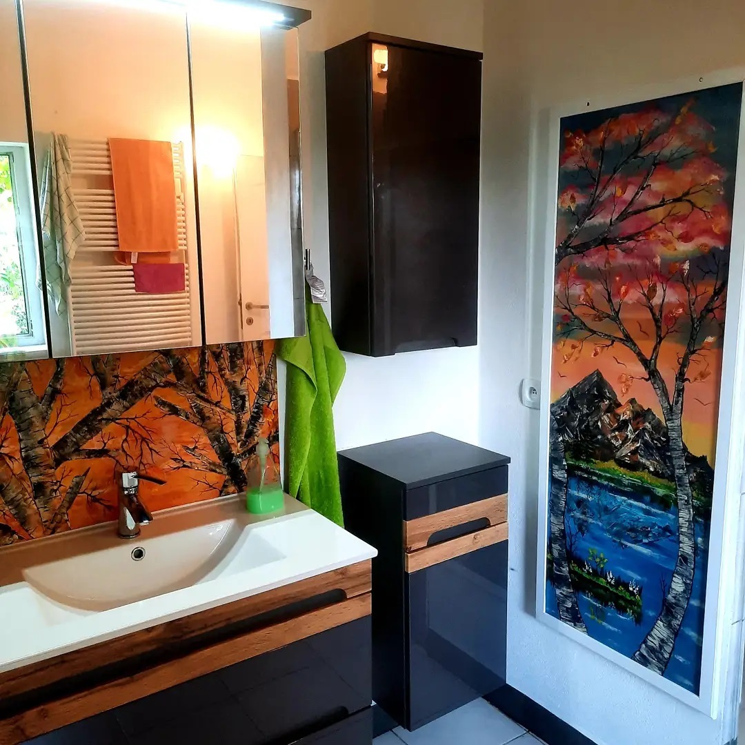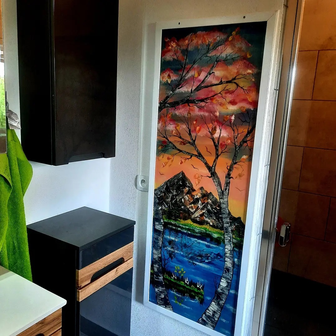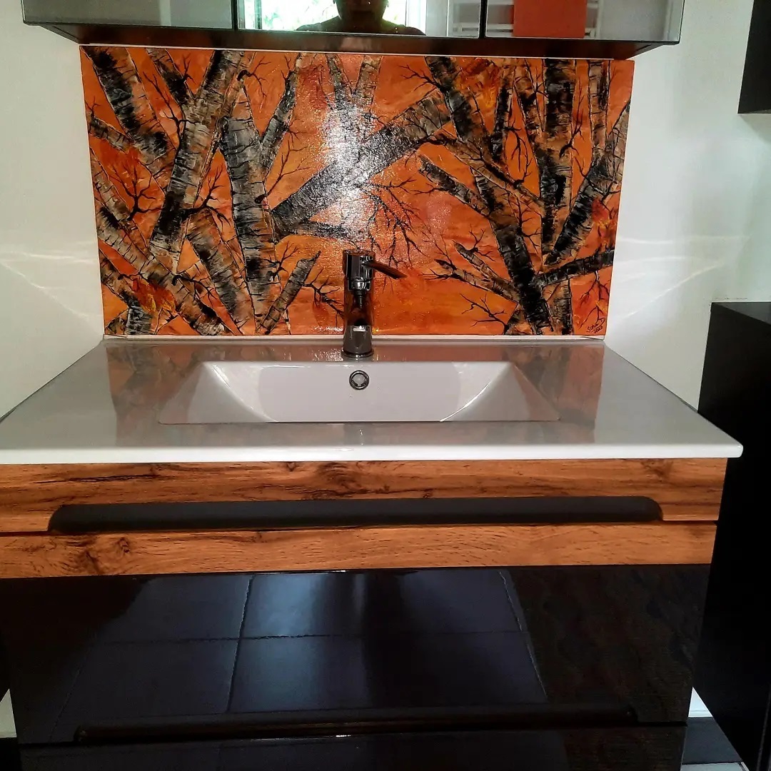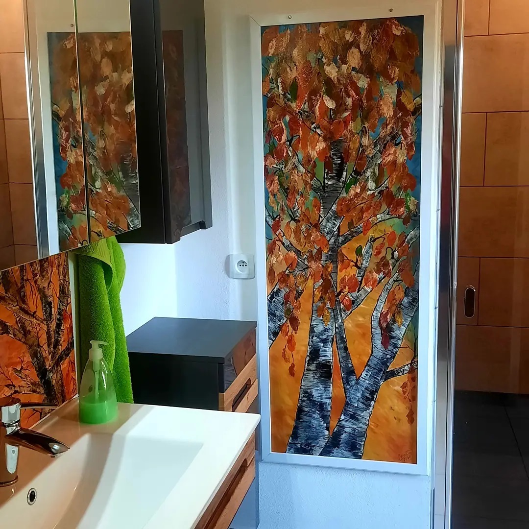 Tady jedna vyladěná koupelna, nad umyvadlem dekor břízy o velikosti 40 x 60cm, malovaný na překližce a finální úprava tekuté sklo, aby bylo omyvatelné a vodě vzdorné. Na zdi je nalepeno.