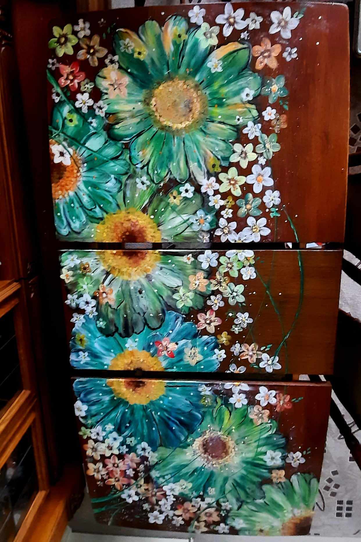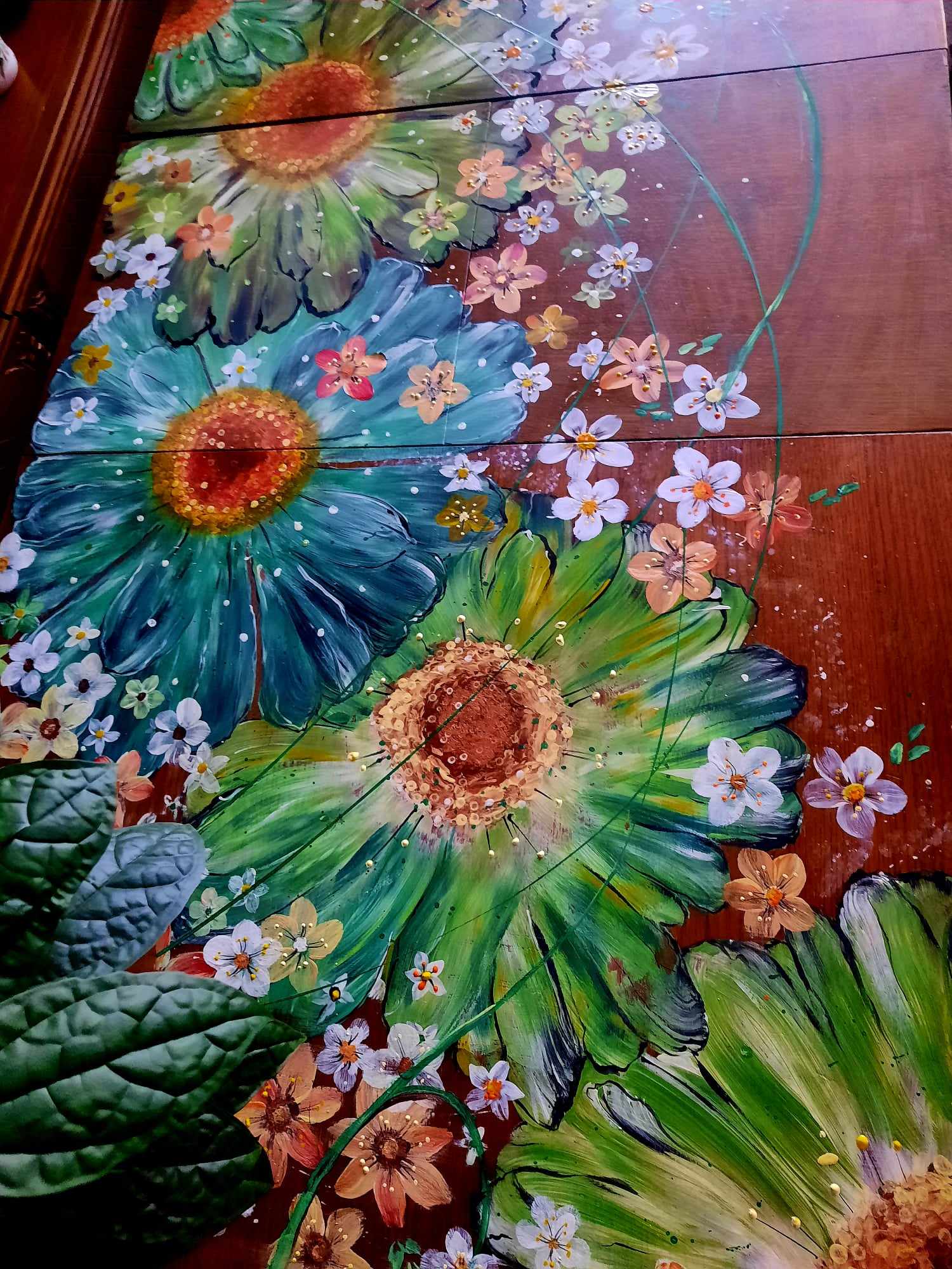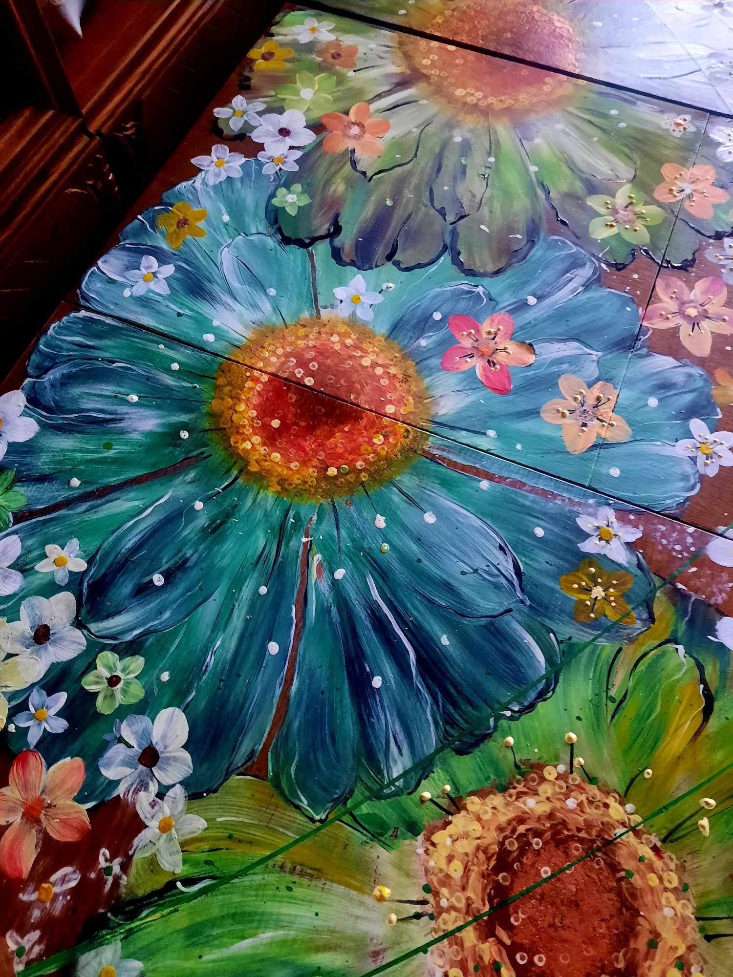 Renovace, malování na stůl, nový kabát ošoupanému jídelnímu stolu, daly velké květy, malované s lásko.