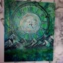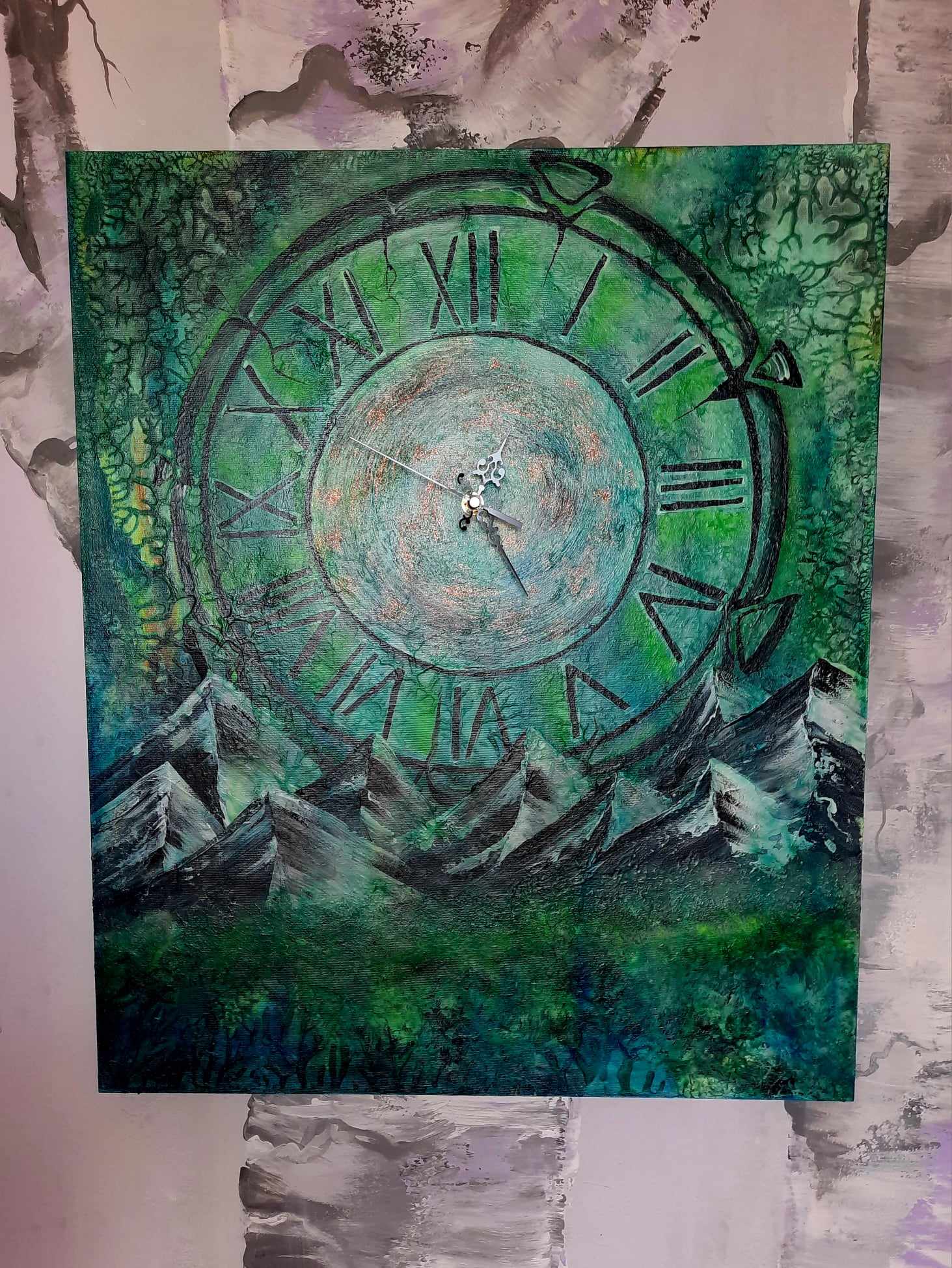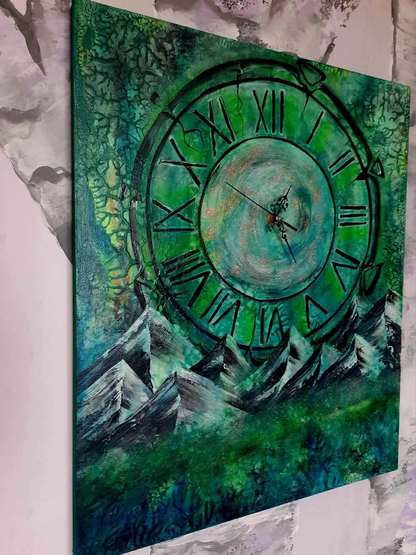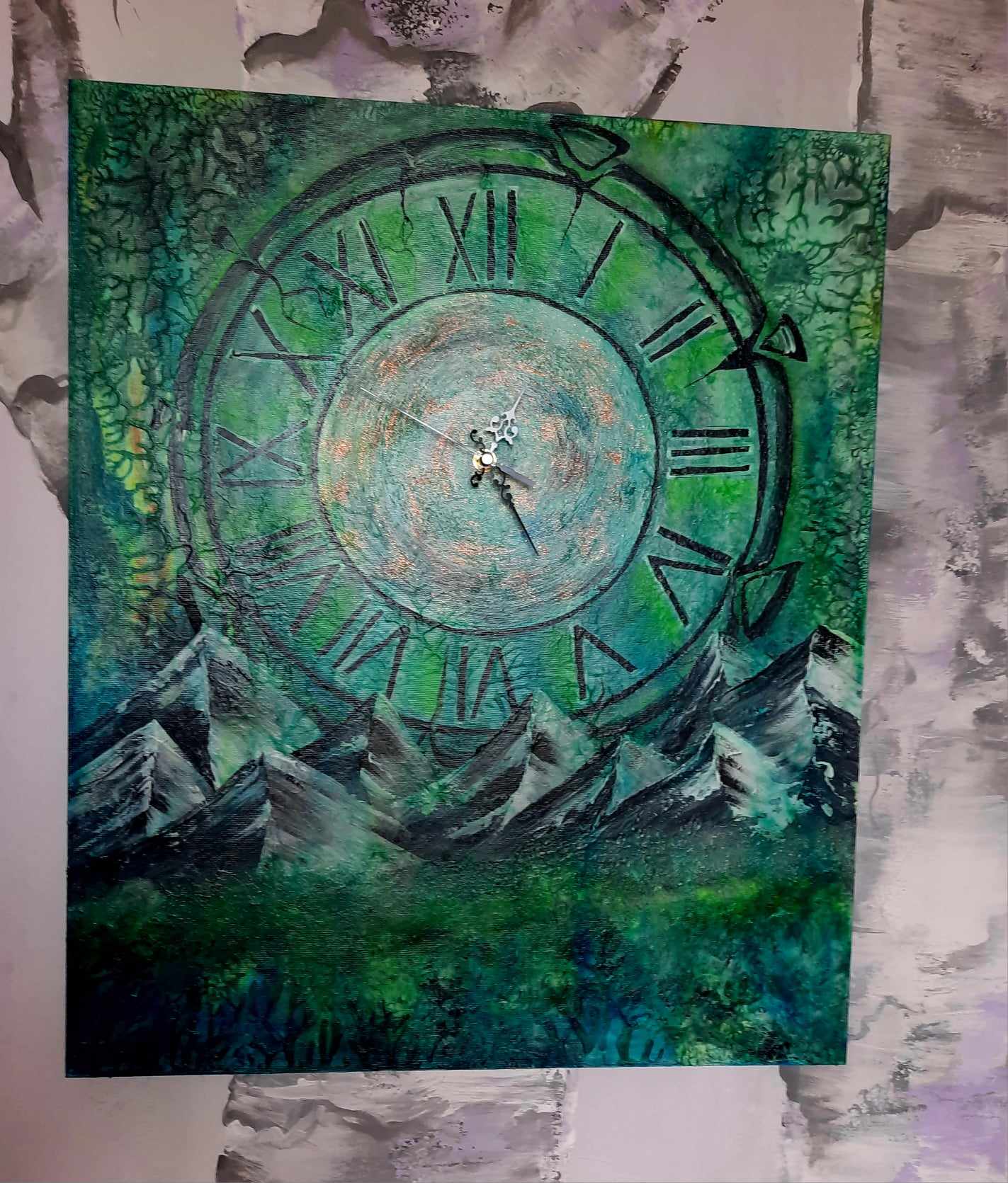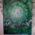 Akryl na plátně, funkční hodinový strojek, podrámovaný obraz o velikosto 60 x 50 cm