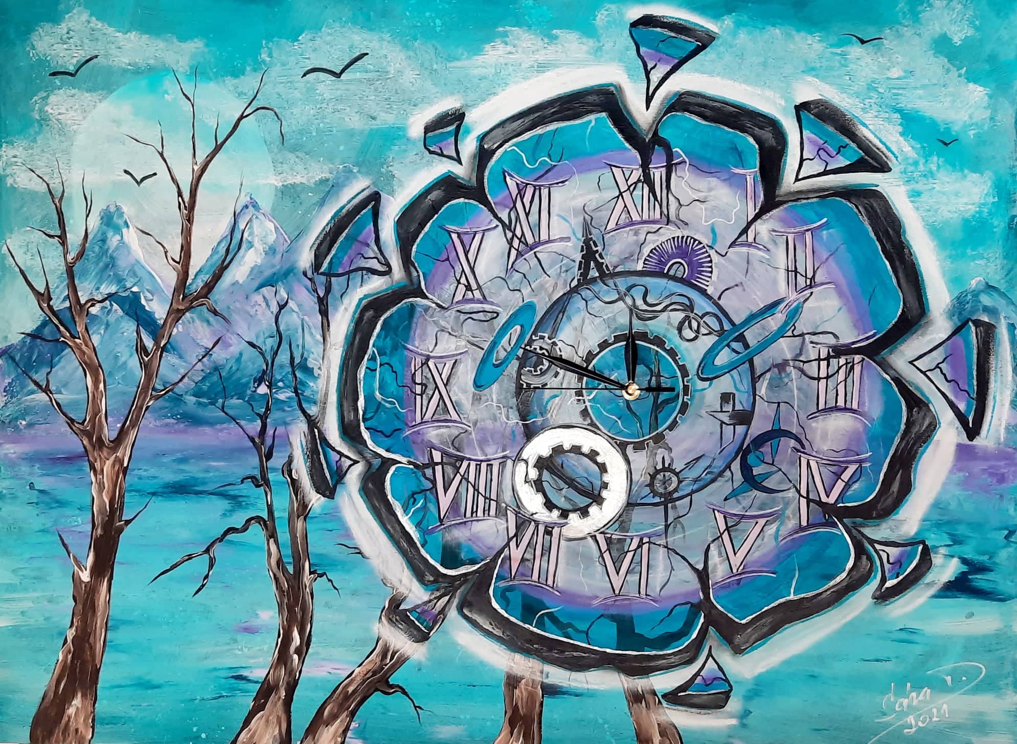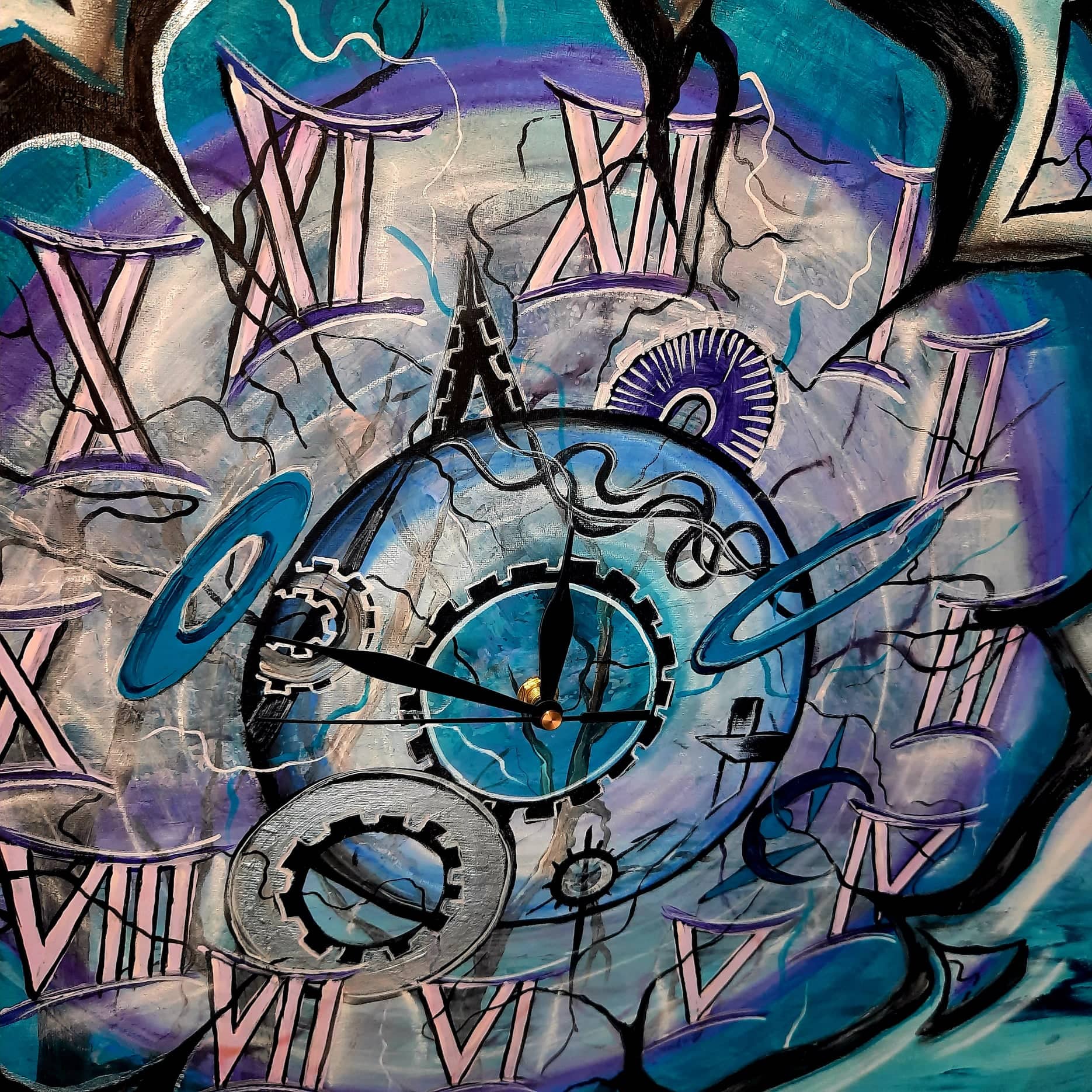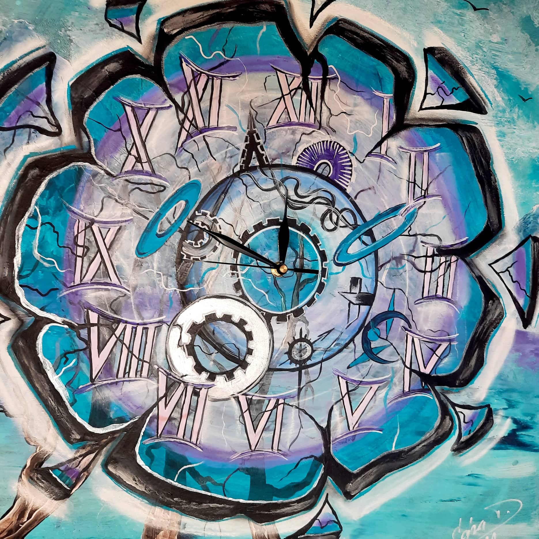 Ojiněné ručičky hodin stejně odbíjejí náš čas.Hodiny funkční, malované akrylem na plátně na desce, podrámované, snadné zavěšení, strojek na baterku